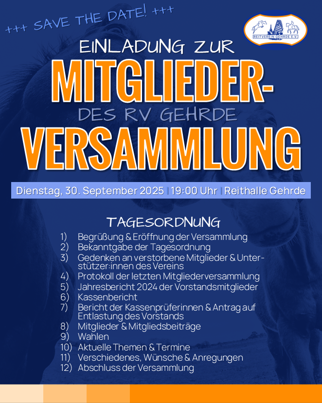 hiermit möchten wir euch zur nächsten Mitgliederversammlung unseres Vereins einladen. Neben den Standardpunkten wie den Wahlen oder der Festlegung der Mitgliedsbeiträge stehen auf der Tagesordnung vor allem der Rückblick auf das Jahr 2024, den großen Umbau der Reithalle und die bisherigen Ereignisse, die das Jahr 2025 bisher für unseren Reitverein gebracht hat. Tragt euch diesen Termin also unbedingt in euren Kalender ein.