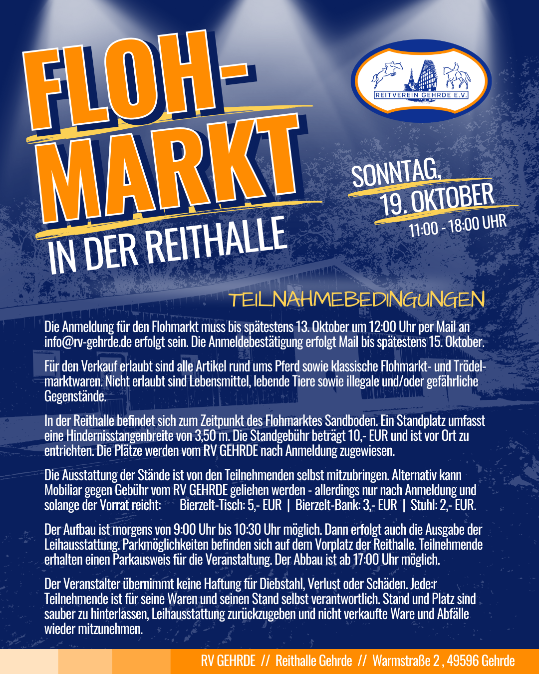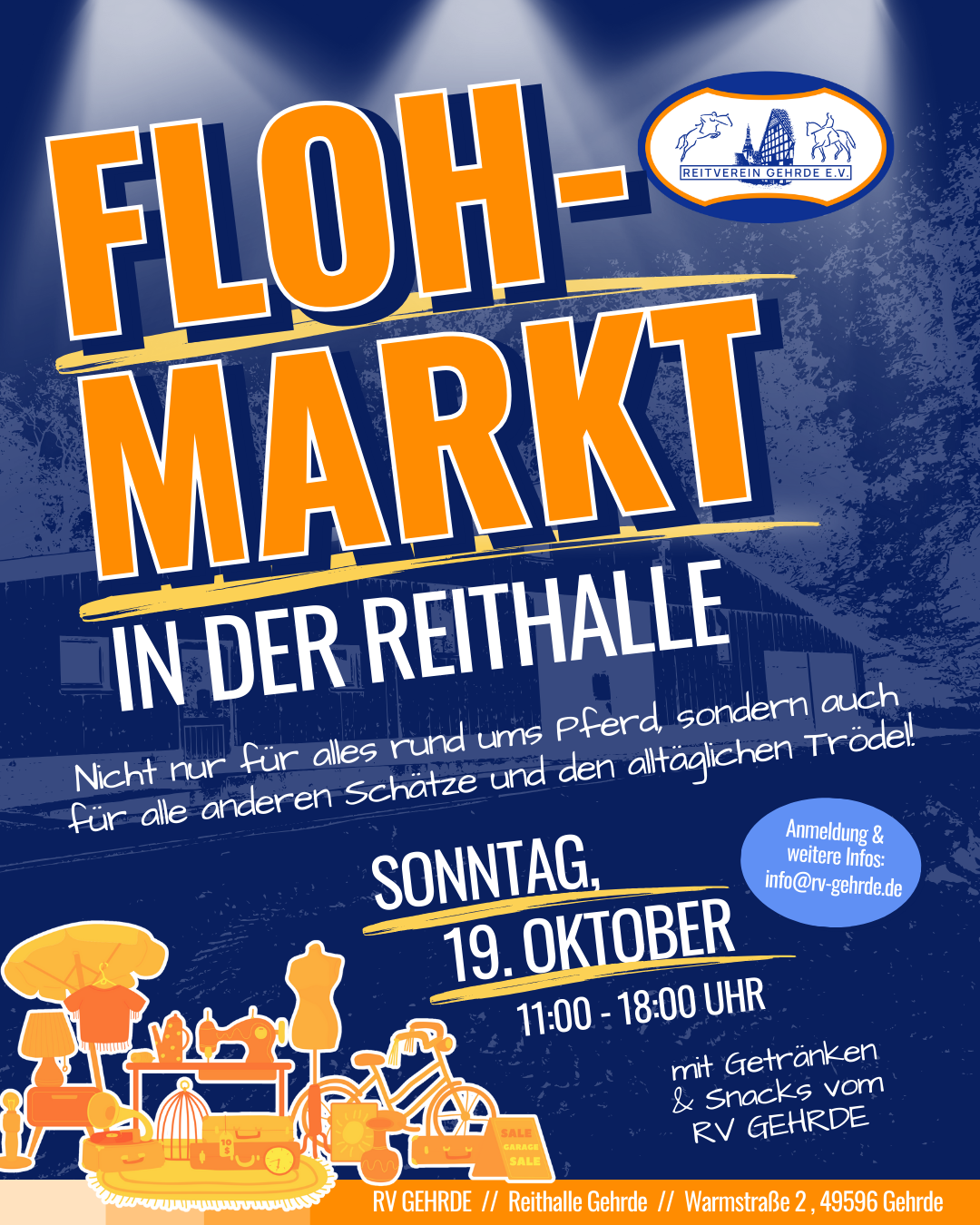 Parallel zum Martinsmarkt in Gehrde starten wir in diesem Jahr unseren ersten Flohmarkt in der Reithalle. Dort wo sonst Pferde und Reiter:innen ihre Runden drehen, habt ihr an diesem Tag die Möglichkeiten, eure aussortierten Schätze an neue Besitzer:innen zu bringen oder einfach selbst an den Ständen der anderen zu stöbern.
